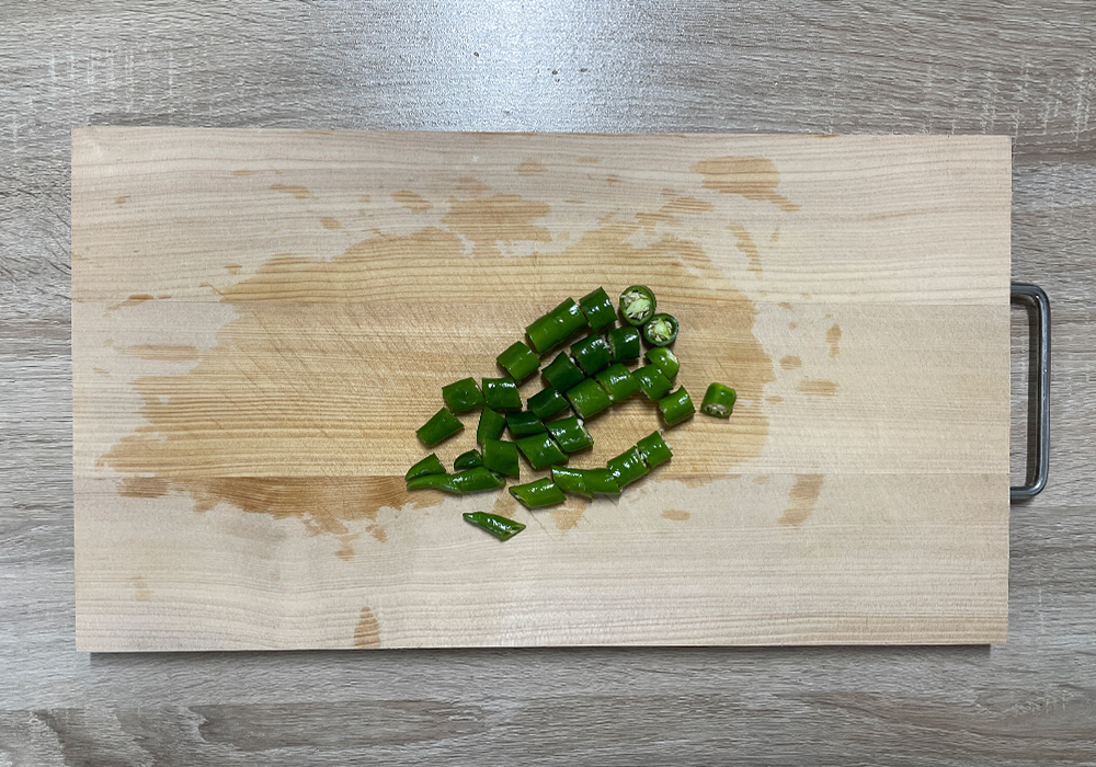 청양고추도 양파의 가로와 비슷한 길이(1cm 정도)로 썰어준다.
